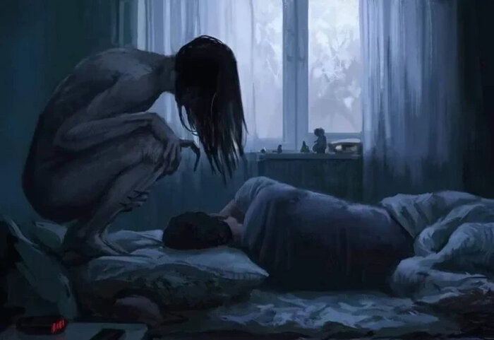Вспомнила я жуткий случай который произошел шесть лет назад. Из-за него я по сей день никогда не сплю на спине. Сейчас расскажу почему. В тот день я переутомилась и буквально еле дошла до постели. Упала на спину и сразу заснула. Думала, что просплю сутки. Ага, конечно. Ночью первым ощущением было, что собака залезла на грудь. Или человек буквально сел на грудную клетку. Не могу сделать вздох и выдох. Открываю глаза и вижу, что впереди темнота. Нет никого на груди. Хочу стянуть одеяло, а руки не двигаются. Да вообще все тело не двигается. И тут краем глаза я вижу ЭТО. Раньше когда я смотрела фильмы ужасов, то порой даже смеялась. Неужели люди могут так испугаться? Испугалась ли я? Это мягко сказано. Я буквально видела женщину в белом платье. Лица было не видно, голова с длинными волосами опущена вниз. Но я ощущала ее взгляд на себе. Она просто стояла и смотрела на меня и я понимала, что стоит мне двинуться, как она нападет. Пытаюсь позвать на помощь, кричу и слышу только тишину. Голоса
