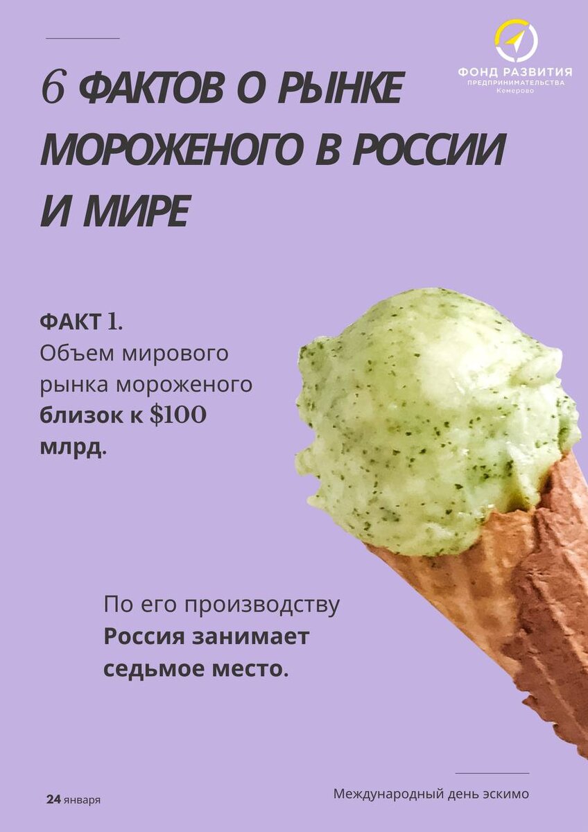 Факт 1: Знали ли вы, что по производству мороженого Россия занимает 7 место в мире?! При этом объем мирового рынка мороженого близок к $100 млрд. Факт 2: Россия является одним из лидеров среди стран по частоте потребления мороженого. Только в 2023 году жители России съели 3,3 килограмма этой сладости на человека! Факт 3: Крупнейший производитель мороженого в России компания «Айсберри» планирует строительство своей второй фабрики в Африке и рассматривает этот рынок как перспективный.