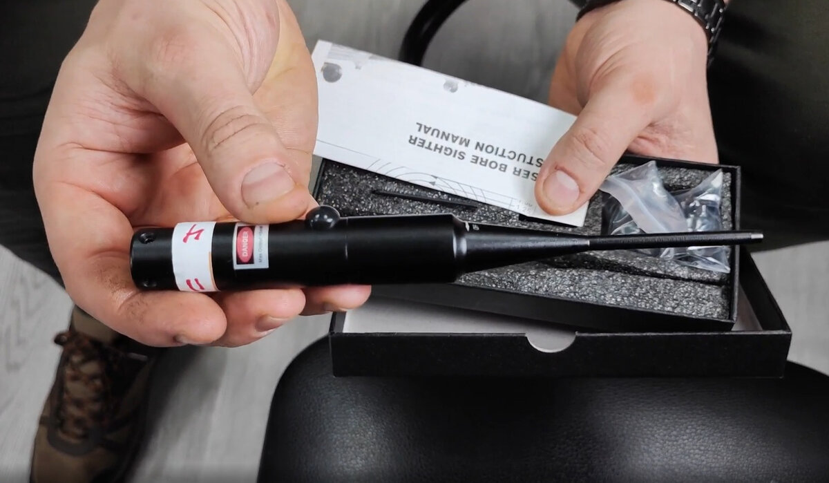 На «хвост» устройства устанавливается (прикручивается по резьбе) переходник. Конструкция вставляется в ствол оружия.