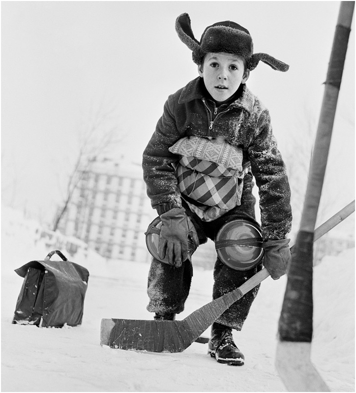 Черно-белый снимок был сделан в 1961 году, когда у мальчишек не было хоккейной экипировки. Парень на фотографии примотал к коленям обычные металлические чашки, а к животу привязал бабушкину подушку