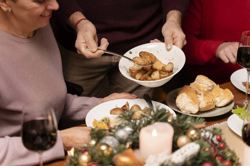 Соблюдайте режим питания Чаще всего, выступая в роли принимающей стороны и готовя праздничный ужин, мы практически ничего не едим в течение дня. Максимум — перекус на быструю руку. И это самая частая причина перееданий, потому что к тому моменту, когда вы наконец-то сами сядете за стол, на пустой желудок вы съедаете гораздо больше, чем в обычные дни. Самый простой выход из ситуации: следить за своим питанием, чтобы даже в самый хлопотный день у вас был и завтрак, и обед, и легкие перекусы между ними. Фото: freepik.com Готовьте в меру «Помериться», сколько каждый приготовил «тазиков» салатов к новогодним праздникам, — тоже одна из традиций Нового года по-русски. Готовьте столько, сколько вы действительно сможете съесть в первые день-два. Не храните еду целую неделю. Ее вкусовые качества теряются, она портится, и в конце концов все равно выкидывается — теми же тазиками. К тому же, как правило, большинство новогодних блюд очень калорийные, жирные и заправляются майонезом. Замените его на