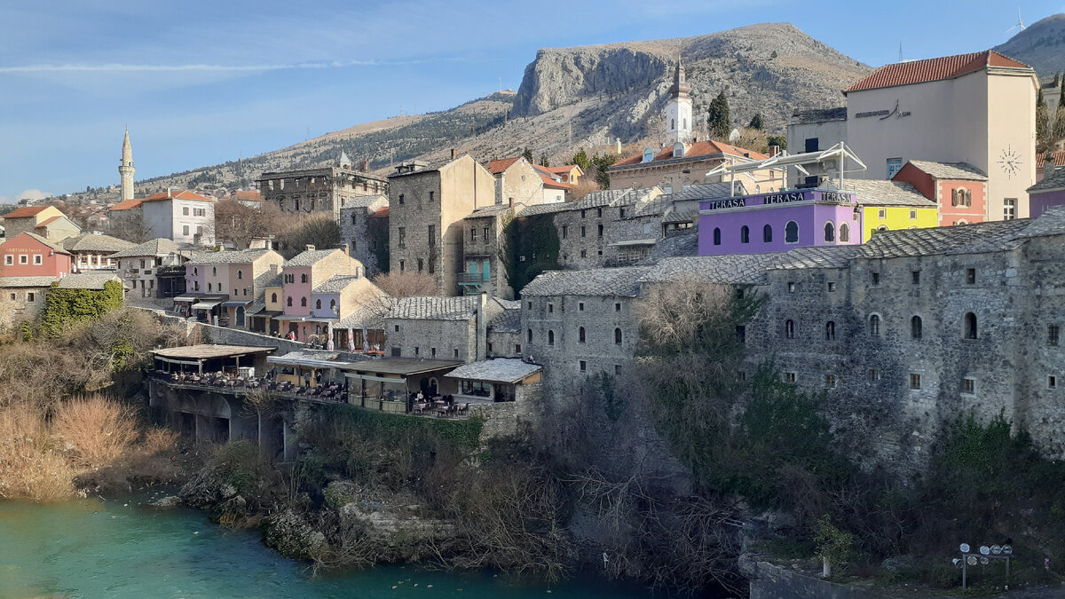 По обе стороны реки Неретва есть уютные кафе с местной кухней и потрясающими видами. Если идти со стороны железнодорожного вокзала в сторону старого города, то у вас на пути будут сувенирные киоски, кафешки, рестораны. Архитектура помимо главной достопримечательности «Старый мост» представлена также минаретами, церквями, башнями, переходными мостами давних времен. Кто любит исторические события, то вам сюда, с этим мостом связано очень много событий.