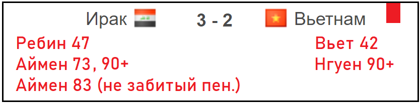 На Кубке Азии полностью сыграла группа D. Кто пробился в 1/8 финала? Начинаем рассказ с результатов. Ирак, ожидающий соперника по плей-офф, одержал третью победу в группе над Вьетнамом (3:2), который первым открыл счет на 42-й минуте. Однако, тут же случилась беда. Команда получила удаление игрока. Во втором тайме Ирак стали спасать Ребин и лучший бомбардир турнира Хуссейн Аймен, которого тренер вынужден после перерыва выпустить на поле. В концовке игры Хуссейн не смог сделать дубль, не реализовав пенальти. А вот Вьетнам воспользовался своим шансов и сравнял счет. Но когда команды ждали финальный свисток Хуссейн Аймен всё-таки сделал дубль. Итого, у Ирака 3 победы кряду, в каждом матче пропущен минимум гол. Япония в параллельной игре нанесла поражение прямому конкуренту Индонезии со счётом 3:1. Японцы, которые после двух туров имели 3 очка, сразу взялись за дело. На 6-й минуте забил Уэда из Фейеноорда, на 52-й он же удвоил счет. Под занавес игры индонезийцы забили в собственные и чужие