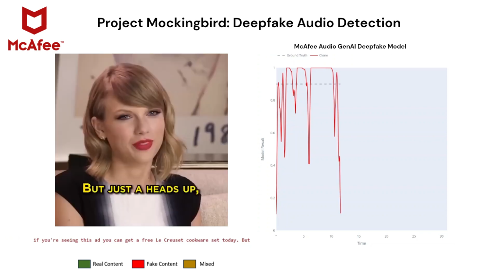Несколько дней назад McAfee анонсировала свой инновационный проект Mockingbird на выставке CES 2024. Это технология обнаружения звука Deepfake на базе искусственного интеллекта, в которой используется усовершенствованная модель искусственного интеллекта от McAfee Labs, которая обучена обнаруживать звук, сгенерированный искусственным интеллектом. На момент анонса компания заявила, что эта технология с точностью более 90 % обнаруживает и выявляет злонамеренно измененный звук в видео. Теперь на YouTube появилось демонстрационное видео, разоблачающее мошенничество с использованием фальшивого голоса Тейлор Свифт, созданного с помощью технологии искусственного интеллекта. Показанное видео является мошенничеством, которое обещает фальшивую раздачу подарков и просит зрителя ввести некоторые данные. Мошенники использовали части законного новостного сегмента, которые были заменены звуком, созданным искусственным интеллектом, чтобы заманить жертв на регистрацию на мошеннической инвестиционной п