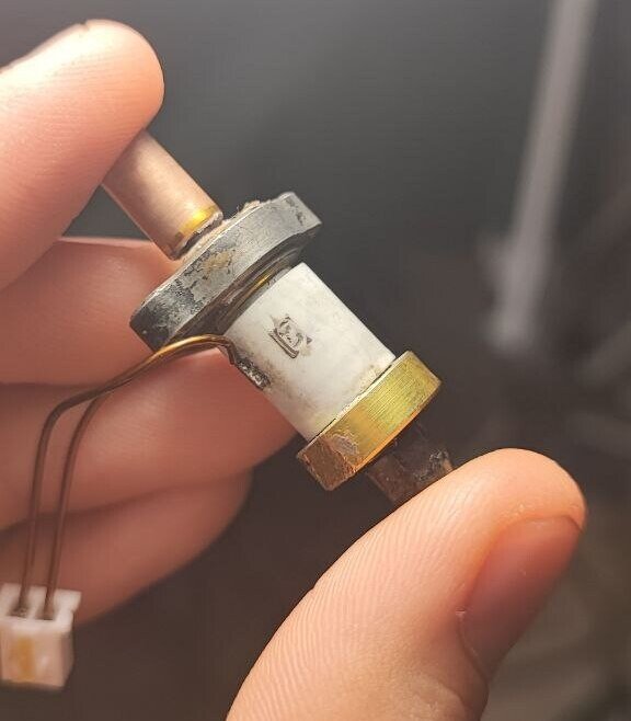 Суть проблемы: Периодически принтер стал выдавать ошибку нагрева экструдера, делал PID хотенда, помогало, но вчера принтер не завёлся вообще, стоял в ошибке экструдера. Разобрал экструдер, а один из концов керамического нагревателя отгорел и висел в воздухе. Казалось бы всё, поможет только AliExpress, но у сына горит проект, надо много печатать. Решил, чем чёрт не шутит, попробую починить, хотябы времянку. Дремелем, с помощью отрезного диска, пилил керамику до тех пор, пока не нащупал контакт. Подводил 12 вольт лабораторным блоком питания, с помощью игл контактов. Контакт оказался в углу площадки, его не видно совсем, внутри керамики чёрный резестивный слой, не отличимый от соседней черноты. День думал, как закрепить контакт на пятачке диаметром не более 0.2мм. И меня осенило, что можно использовать виток пружины с заострённым концом. Подобрал похожую пружину, внутренний диаметр 10мм, диаметр проволоки около 1мм. Срезал виток дремелем, загнул контакт, заточил его в иглу. Разогнул виток