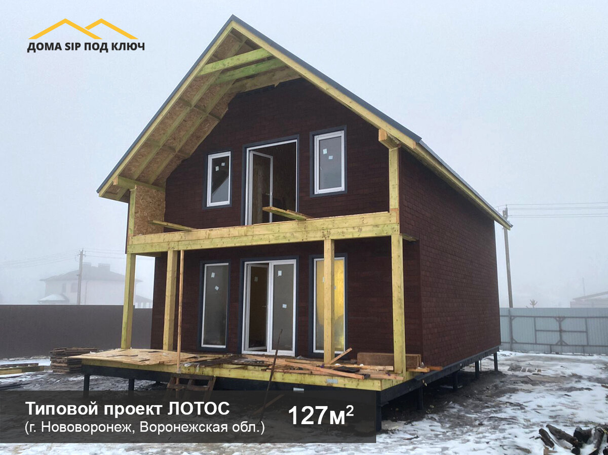 Уголок провинциальной Европы в самом сердце Центрального Черноземья. Дом по типовому проекту ЛОТОС 🌸 специалисты ДСПК построили в рекордные 8 недель! Дом достаточно большой – 127 м². На первом этаже расположена кухня-гостиная, небольшая спальня и компактный санузел. На втором - три спальни и ванная комната. Терраса на 1-ом и лоджия на 2-ом этаже добавляют в проект европейское изящество и воздушность. Подробнее о полном комплексе работ читайте ниже👇 ДОМ из СИП панелей по проекту Лотос в г. Нововоронеж, Воронежская обл. S дома = 127м2 Полный комплекс работ: ✅ Свайно-винтовой фундамент Винтовые металлические сваи 108мм, цементно-песчаная засыпка, оголовок 250х250мм ✅ Пиломатериал - Камерная сушка с обработкой огне-биозащитой Neomid - Калиброванный брус/доска ✅ Сборка дома из СИП панелей: - пол 174мм - стены 174мм - межэтажное перекрытие каркасно-балочное (лаги 50х200) с зашивкой ОСП 22мм - высота этажей 2,5м и 3,9м ✅ Монтаж кровли Мягкая черепица Shinglas от Технониколь ✅ Оконные констр