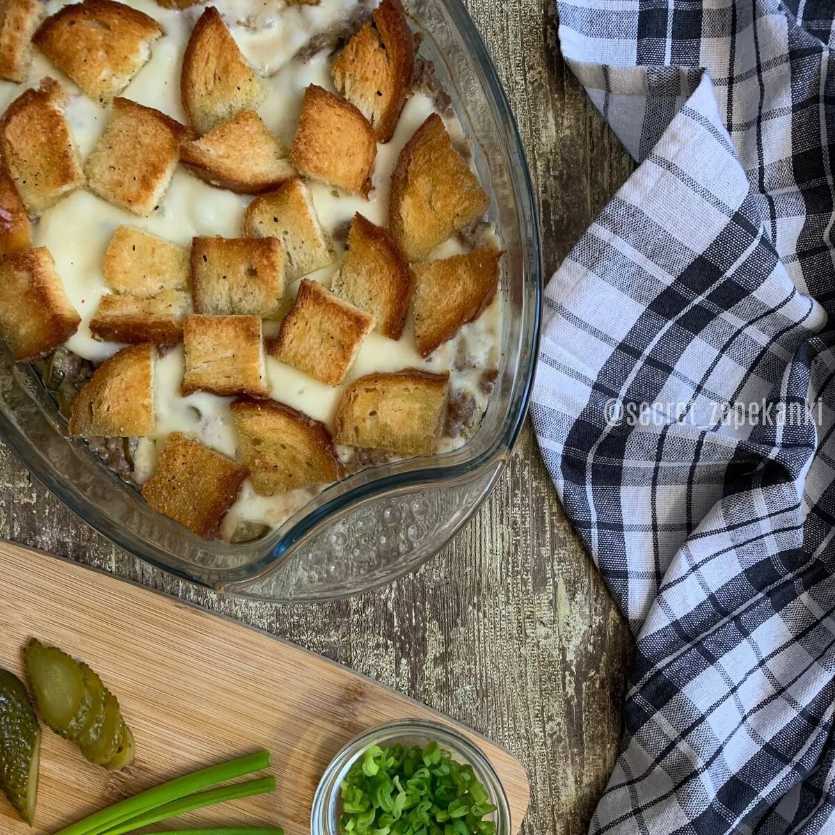 Я уже делилась с вами своими размышлениями на тему того, что практически любое блюдо может сущестовать в другом состоянии – в запеканке. И вот ещё одно тому подтверждение. Запеканка-чизбургер! Два блюда в одном и тот (удивительный) случай, когда фастфуд превращается во вкусную домашнюю еду. Готовим: ⁃ фарш говяжий 400 г ⁃ лук 1 шт. ⁃ чеснок сухой 1 ч. л. ⁃ огурчики маринованные 4-5 шт. ⁃ сыр сливочный 130 г ⁃ сыр моцарелла для пиццы 250 г ⁃ батон нарезной 4-5 кусочков ⁃ масло оливковое ⁃ соль, перец ⁃ лук зелёный для подачи (по желанию) Форма 30*21*6 см, объёмом 2 л. Лук нарезаем кубиком и обжариваем на оливковом масле до золотистого цвета. Выкладываем фарш, обжариваем до готовности. Добавляем сухой чеснок, соль и перец. Огурчики нарезаем полукольцами или на четвертинки. Отправляем их к фаршу, буквально для того, чтобы они прогрелись в нём. Отставляем сковороду. Моцареллу делим на две части – 100 и 150 г, меньшую часть нарезаем кубиком, бóльшую – пластинами. Батон на