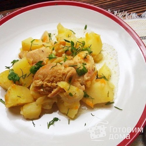 Уменьшите огонь и готовьте курицу с картошкой в майонезе под закрытой крышкой около 15-20 минут до готовности картофеля. Приправьте тушеную картошку с курицей зеленью - петрушкой или сельдереем.