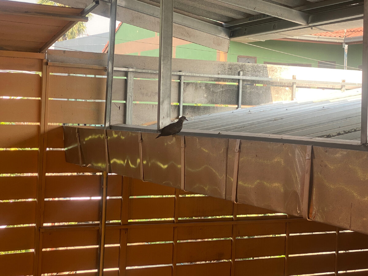 Утром приготовил яичницу для себя и моих приятелей Насти с Робертом. Птенец вышедший со мной на прогулку, вспорхнул и залетел на крышу дома.