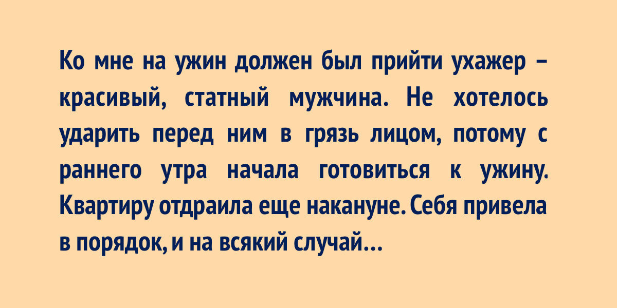 Ко мне на ужин должен был прийти ухажер – красивый, статный мужчина. Не хотелось ударить перед ним в грязь лицом, потому с раннего утра начала готовиться к ужину. Квартиру отдраила еще накануне. Себя привела в порядок, и на всякий случай… заранее накрасилась и нарядилась – вдруг заявится пораньше. А сама ужином занялась. Пришел он, все великолепно – сидим, поддерживаем беседу. Но замечаю, что он как-то странно на меня смотрит. Потом пошла в ванную “припудрить носик” и вижу, что у меня на голове шапочка для душа - я ее надела, чтобы волосы с еду не налетели, а снять забыла. Поржали от души….