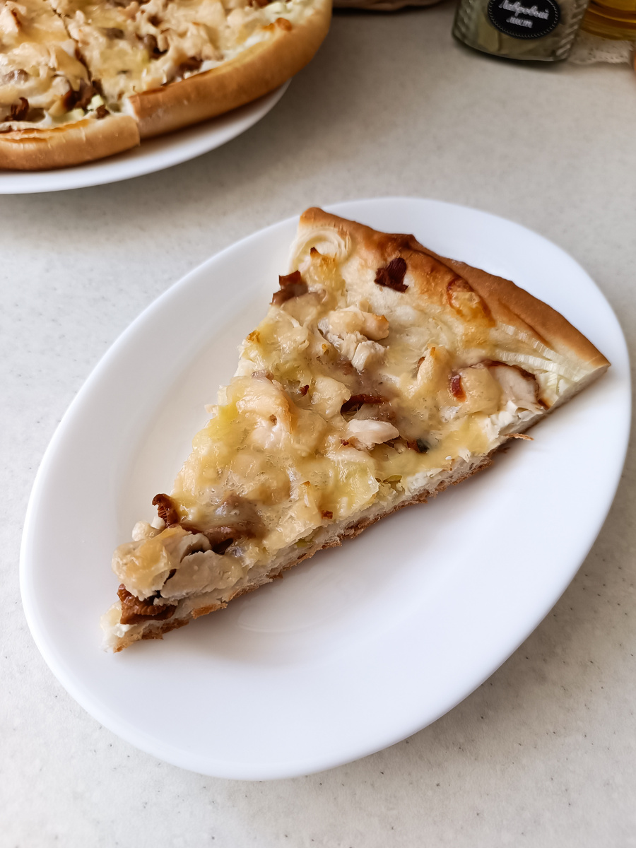 В нашей семье все очень любят пиццу! А для меня она как палочка-выручалочка, если я не знаю, что приготовить, то с большой вероятностью на ужин будет именно 🍕 1. Замешиваем дрожжевое тесто, оставляем в теплом месте для подъёма. Тесто можно взять покупное или приготовить самим по рецепту булочек-пампушек. Очень вкусная выпечка получается из холодного дрожжевого теста, рецепт которого также есть на канале. 2. Подготавливаем начинку: лисички необходимо слегка обжарить, сыр натереть, куриную грудку нарезать небольшими кусочками, лук мелко нашинковать. 3. Тесто делим на столько частей, сколько хотим испечь пицц (у меня 2 шт.), раскатываем в пласт толщиной ~1 см. 4. Смазываем тесто сметаной, солим, перчим. Выкладываем лук-порей, жареные лисички, копчёную куриную грудку. Сверху обильно посыпаем сыром. Последовательность действий можно посмотреть на видео. 5. Выпекаем ~15 мин в разогретой до 200°С духовке. Пицца с лисичками получается очень вкусная, ароматная и сытная🤤 Не упустите сезон э