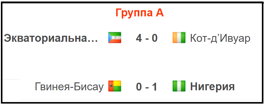На Кубке Африканских Наций полностью завершился групповой этап. Подводим итоги. Рассказываю, кто вышел в 1/8 финала и, кто с кем скрестит копья. Группа А. Результаты 3-го тура. Экваториальная Гвинея вновь забила 4 мяча. Повержен организатор турнира Кот-д’Ивуар (4:0) Гвинея-Бисау – Нигерия (0:1) Таблица. Экваториальная Гвинея – 7 очков. Выход в 1/8 финала. Нигерия – 7 очков. Выход в 1/8 финала. Кот-д’Ивуар – 3 очка. Режим ожидания. Гвинея – Бисау – 0. Вылет. Группа В. Мозамбик – Гана (2:2) Кабо-Верде – Египет (2:2) Таблица. Кабо-Верде – 7 очков. Выход в 1/8 финала. Египет – 3 очка. Выход в 1/8 финала. Гана – 2 очка. Режим ожидания. Мозамбик – 2 очка. Группа С. Гвинея – Сенегал (0:2). Гамбия – Камерун (2:3). Таблица. Сенегал – сама стабильность. 3 победы. 9 очков. Выход в 1/8 финала. Камерун – 4 очка. Выход в 1/8 финала. Гвинея – 4 очка. Режим ожидания. Гамбия – 0 очков. Группа D. Ангола – Буркина Фасо (2:0) Мавритания – Алжир (1:0) Таблица. Недавно узнал, что Ангола возглавляет рейтинг