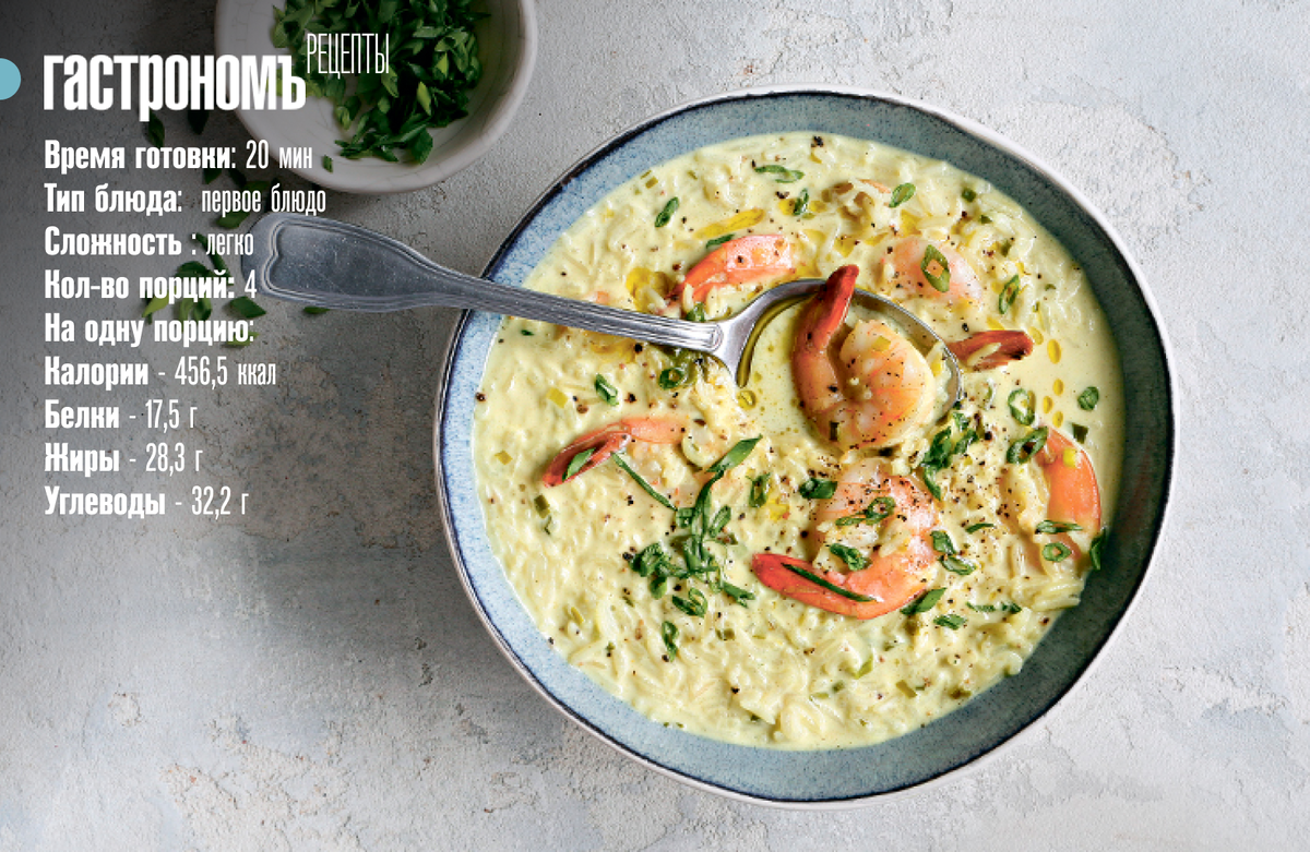 Быстрый суп с креветками напоминает знаменитый тайский Том-Ям. Рецепт адаптирован под нашу кухню и традиции приготовления, слегка упрощен, но от этого не перестает быть таким же вкусным и аппетитным. Изюминка блюда – кокосовое молоко. Это беловатая жидкость со сладким вкусом и особенным ароматом. Его добывают из мякоти ореха, а также широко используют в кулинарии: готовят с ним соусы для рыбы, мяса и морепродуктов, добавляют в каши и кофе, делают молочные коктейли. При этом аромат кокоса тонкий, ненавязчивый и совсем не перебивает вкус блюда. Молоко отлично сочетается с карри и острым перцем, которыми мы приправляем суп. Если хочется чуть больше остроты – добавьте в блюдо перец чили.ъ Ингредиенты Пошаговый рецепт приготовления Шаг 1 Разморозьте креветки. Налейте в кастрюлю 2 ст. л. оливкового масла, всыпьте рис и обжаривайте, помешивая, 3 мин. Добавьте мелко нарезанный зеленый лук и карри, готовьте еще 2 мин. Влейте в кастрюлю кокосовое молоко, долейте 400 мл горячей воды и готовьте на
