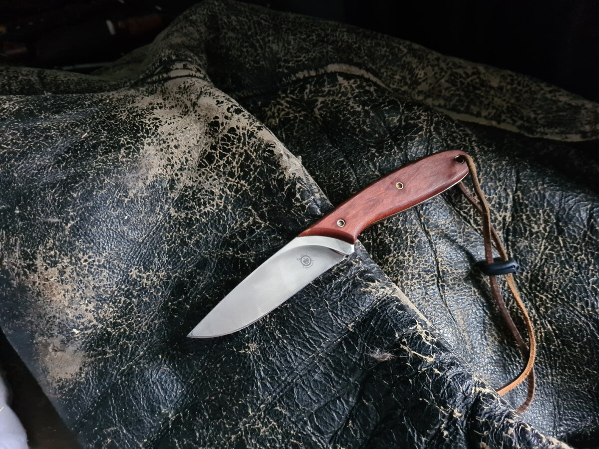 Нож «Лесной» от «Северной Короны». И его уже нигде не купить, ну, по крайней мере, я не нашел. На клинке N695, по сути, 440С, ни то ни сё железяка. Не ржавеет, звезд с неба не хватает, а звездочки-пожалуй. Клин в 4 мм, но спуски от обуха, так что режет очень неплохо. Плюс не стали делать кончик с нос комара, а оставили вполне ковырятельным. На рукояти изначально стоял орех, и дизайнеры забахали любопытное решение: плашки чуть меньше самого ножа. Но поскольку нож очень небольшой, то решение спорное, так как возможно, руку будет заполнять не полностью при работах. Почему возможно? Потому что старый хозяин забахал плашки из кокоболо, и это дерево воистину прекрасно. Для меня абсолютная любовь навсегда-это айронвуд, так вот, кокоболо не сильно хуже. Великолепное сочетание коричневого и черного, ну, у айронвуда оно разве что глубже и более затемнено. И плашки теперь вровень с геометрией ножа. Ножны обычные, говорить особо не о чем.