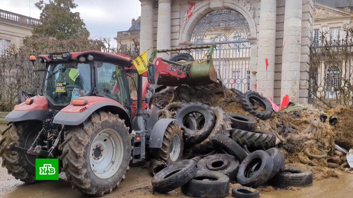 [ Смотреть видео на сайте НТВ ] Протесты фермеров во Франции набирают обороты. Ведущий профсоюз аграриев объявил о бессрочном продлении акций, которые, согласно планам, должны охватить всю страну. Французы привели тракторы в качестве аргумента в споре с правительством, перекрыли трассы на Лион, Бордо, Тулузу, грозят взять Париж. Режис Дерюмо, президент департамента Национальной федерации союзов землевладельцев в регионе Уаза: «Это не фермеры должны оплачивать счета за инфляцию. Не фермеры должны оплачивать счета за войну на Украине. Если у вас нет денег, чтобы отправить на Украину, ищите их, где хотите, хоть в долг возьмите. Но не надо это делать за наш счет!» Тракторы вышли на автотрассу. Жеральд Дарманен, министр внутренних дел Франции: «У нас нет планов силой разгонять демонстрации. Таковы мои инструкции префекту и жандармерии, потому что ущерба протестующими нанесено не было». Полицейские и протестующие подрались по дороге в Испанию. А американскую забегаловку завалили сеном с наво