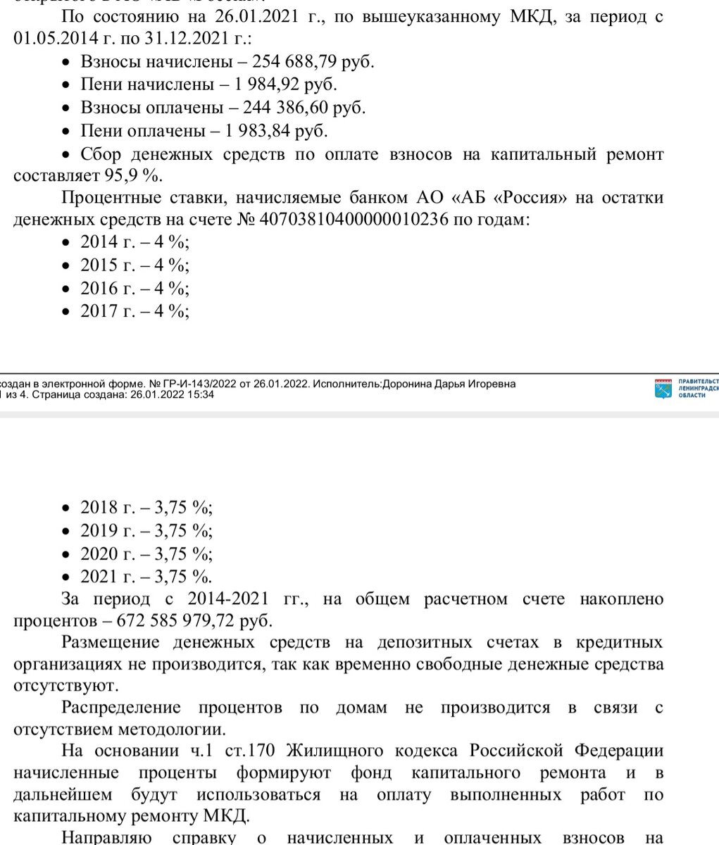 Через ГИС ЖКХ я взяла информацию о денежных средствах.И сумма ответа Фонда капитального ремонта по многоквартирному дому (который я прикрепила выше)отличается от официальных данных. Взносы оплачены 244 386,60 руб. + пени 1983,84 руб.