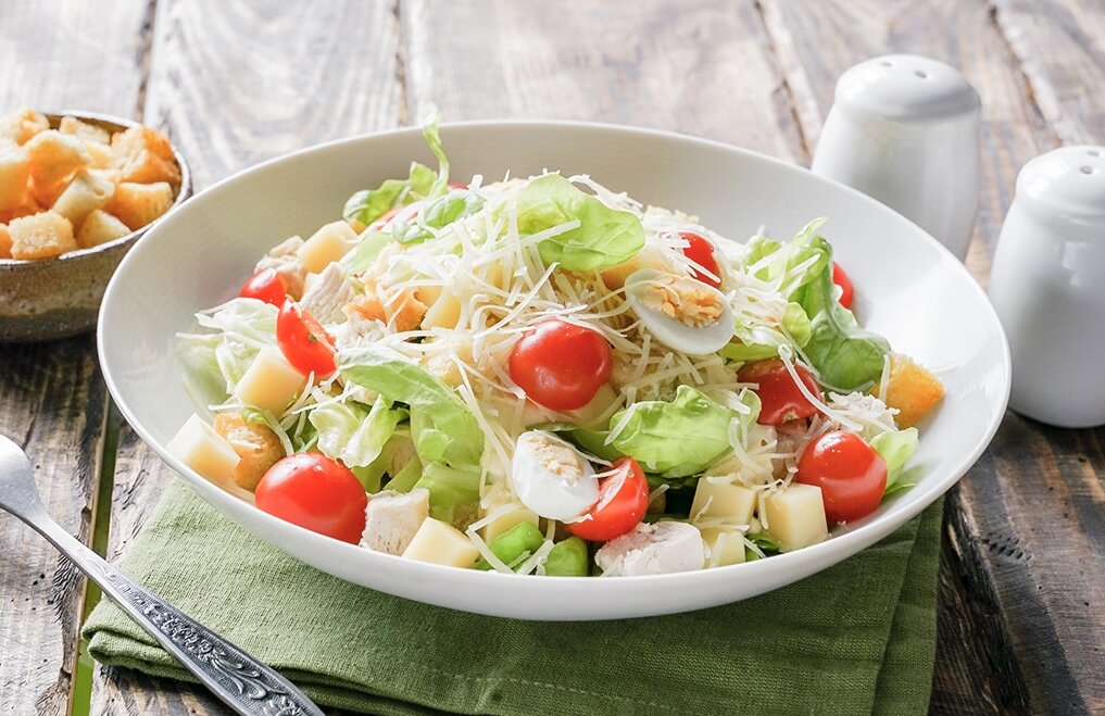 Салат Цезарь – это классическое блюдо, которое завоевало популярность по всему миру. Он сочетает в себе свежесть овощей, нежность курицы и насыщенный вкус заправки. Вот основные ингредиенты, которые обычно используются для приготовления этого салата: Ингредиенты: - Листья салата (обычно римский салат, но также могут использоваться листья айсберга) - Куриное филе (запеченное или обжаренное) - Сухарики (желательно сделанные из белого хлеба) - Помидоры черри (для украшения и добавления свежести) - Приправа (обычно соль, перец, можешь также добавить острые приправы по вкусу) Ингредиенты для заправки: - Майонез - Чеснок - Лимонный сок - Сыр пармезан - Дижонская горчица - Соевый соус - Соль и перец Приготовление: 1. Обжарь куриное филе на сковороде или запеки в духовке, приправив по вкусу. Оставь его остывать, затем нарежь на небольшие кусочки или полоски. 2. Нарви листья салата руками на небольшие кусочки, положи их в большую миску. 3. Добавь обжаренное куриное филе и сухарики на салат