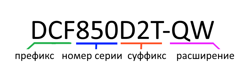 Продукция компании Dewalt широко известна во всём мире, но далеко не каждый знает, как расшифровываются их артикула. Набор цифр и букв в данном случае представляет собой полезные и нужные сведения, делая артикул Dewalt одни из самых информативных среди производителей инструмента. Из чего состоит артикул Артикул Dewalt состоит из 4 частей: префикс, номер серии, суффикс, расширение. Рассмотрим для примера аккумуляторный ударный шуруповерт Dewalt Atomic DCF850D2T-QW DCF — Аккумуляторные шуруповерты, гайковерты. 850 — номер серии, D — ёмкость батареи 2 Ач, цифра 2 после буквы — два аккумулятора в комплекте + зарядное устройство, T - инструмент поставляется в кейсе Tstak, QW — аккумуляторный инструмент Dewalt. Префикс Буквы идущие перед номер серии, количество может отличатся в зависимости от серии, у инструмента 3 буквы, у расходки (пильные диски, буры и т. д.) и сопутствующих товаров 2, а у модульных систем Tstak и ToughSystem — 4. DCD — аккумуляторные дрели-шуруповерты. DCF — аккумулято