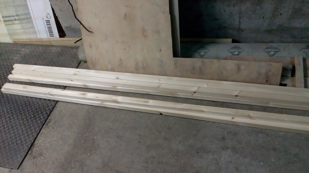 Итак, фасады готовы и пришло время каркаса. В первую очередь рисуем план каркаса и делаем расчеты. Под столешницу решил сделать максимально крепкий Г-образный каркас, устойчивый к любым разумным и неразумным нагрузкам. Будет он состоять из двух частей: длинной, для двух двустворчатых шкафчиков и короткой, для мойки с одной створкой. Рамки из бруса 40х40 с укосинами, верхней и нижней обвязкой. Нижний цоколь сделаю по месту, т.к. столешница должна переходить в подоконник. Фасады планировал навешивать на обычные мебельные петли с нахлестом на брус 15мм, что значительно упростит разметку под петли. Стойка между двумя двухстворчатыми шкафчиками нужна шире. Опытным путем выяснилось чтобы две соседние дверки можно было открыть одновременно, нужен зазор минимум 30мм. Для этого подойдет брус 60х40 мм (2х15мм нахлеста дает искомые 30мм зазора). Длинная часть каркаса получилась высотой 770 мм, длинной 1820 мм и глубиной 530 мм. Короткая часть: высота и глубина те же, длинна 1140 мм (не буду гр