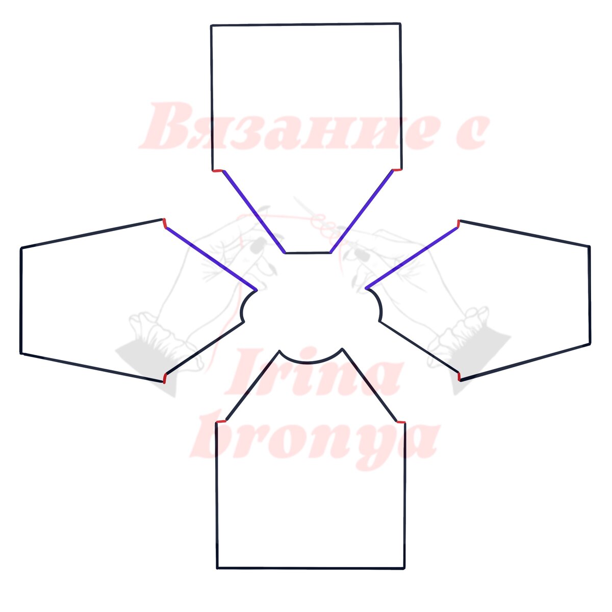 Рубрика «Вязальные шпаргалки». Реглан снизу можно вязать по-разному: 1 способ: Шивной, когда все детали вяжутся отдельно и потом сшиваются. Обратите внимание на чертеж: Красным выделены на всех деталях убавки для проймы, чтобы изделие не тянуло и не мешало движению рук. Синим выделены линии реглана на детали спинки и задней части рукавов, они длиннее, чем регланые линии по переду, засчет этого формируется росток. Вырез по детали спинки ровный, по рукавам формируется плавный скос, а по переду углубление выреза горловины. Как формируется скос по рукаву, вы можете посмотреть в видео: https://rutube.ru/video/e96ba8ec44c61b14da73d1853b6e9e44/ - Плавный скос плеча спицами. 2 способ: Связать детали переда и спинки, также 2 рукава до пройм, потом собрать их на одни спицы и продолжить вязание по кругу с убавлением петель вдоль регланных линий. Длина регланных линий, расчет петель для выреза горловины, вывязывания ростка делается также, как при вязании реглана сверху. Посмотреть все э