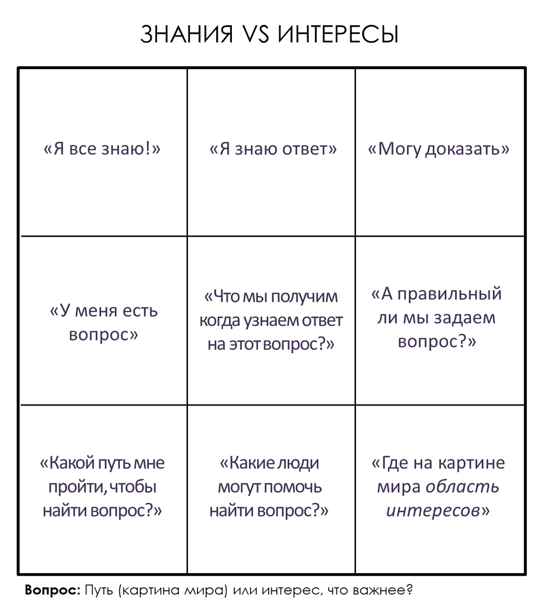 от ответов в школе, к вопросам, которые учат формулировать в университетах, к интересам, что либо дано от природы, либо ускользает от нашего взора, как эмоции человека играющего в покер. Пожалуй повторю свою вчерашнюю мысль одной матрицей: Дело в том, что нам должно внушали, что все проблемы от того, что мы не знаем правильных ответов, достаточно их узнать или найти и все будет в порядке. Возможно эта позиция характерна для эпохи модерна, некого аналога эпохи Ренессанса, расцвета техники, веры в прогресс и беспредельные возможности человека. Как тут не вспомнить: "Разум и труд человека, дивные дивы творят!" И вот мы узнали, что 2х2=4, бином Ньютона, уравнение Бернули, и