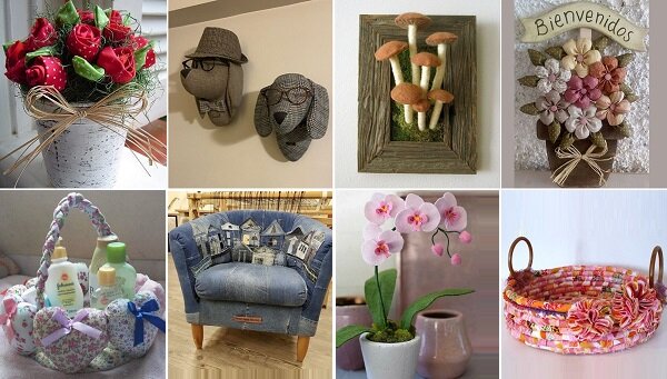 Ткань, шерсть и фетр — доступные материалы, работу с которыми, в отличие от дерева, металла, камня способен освоить практически каждый! Предваряя комментарии некоторых читателей, стоит оговориться, что текстильный декор, действительно, пылесборник еще тот. Но этот пост не об этом! Вазоны с розами Как вам эти милейшие композиции? Их можно выполнить из шелка, сатина или коттона! Лоза и дерево Позитивная композиция с участием ярких подсолнухов гармонично будет смотреться в корзине. А цветочки из хлопковых тканей для пэчворка — в деревянном фальш-горшочке. Корзинки Корзинка, собранная из сердечек, наполненных холлофайбером — идея в романтичном стиле. Корзина с деревянными ручками, собранная из каната, обвитого полосой, сшитой из разноцветных тканей (но гармонично сочетающихся между собой) — аксессуар в душевном деревенском стиле. Короба и шкатулки Короба и шкатулки, выполненные в технике квилт, подойдут для хранения игрушек, пряжи, разных мелочей. Настенные панно Эта довольно креативная ид