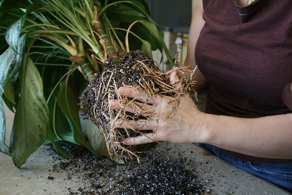 - Внимательно осмотрите корневую систему монстеры и аккуратно срежьте все почерневшие, засохшие фрагменты садовыми ножницами или острым ножом, заранее обработав его спиртом.