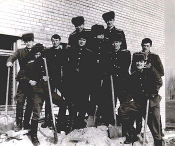 Прорвало трубу канализации под спальным корпусом. Отделение дежурного взвода училища ( наша учебная группа) в противогазах, разделившись составом на вход-выход лопнувшей трубы, решает задачу по её прочистке, прямо противоположную той, которую решали два утёнка, что пытались заглотить одного червяка.