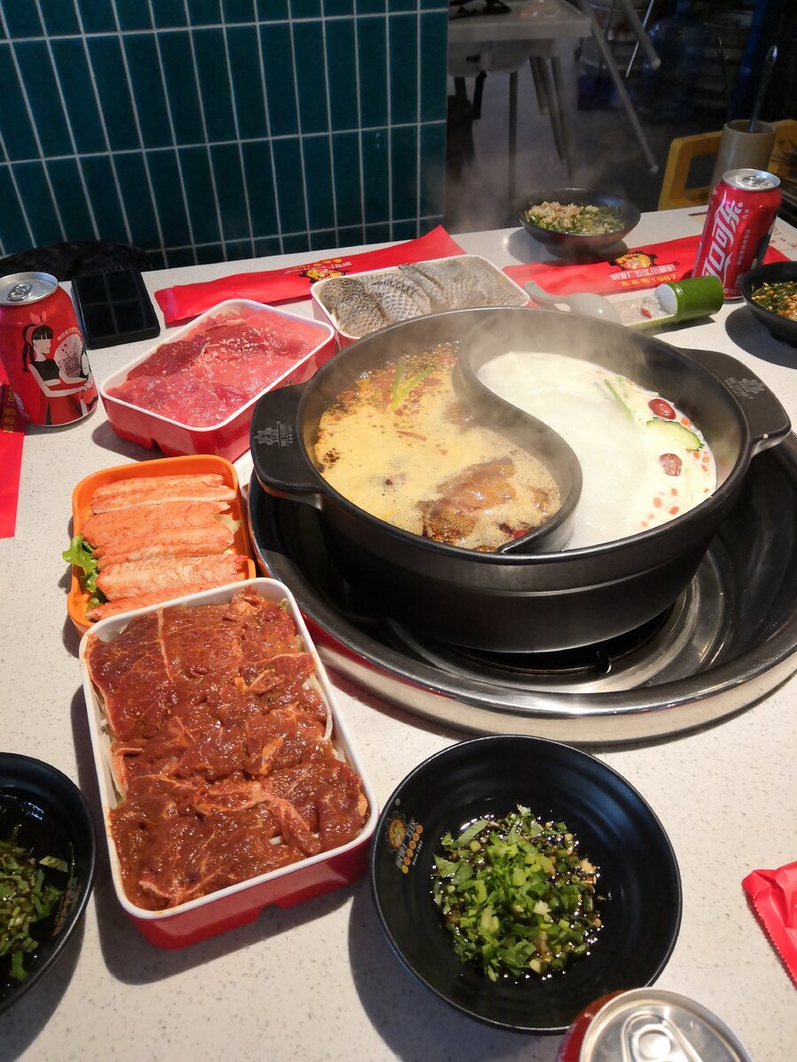 Сегодня хотим познакомить вас с китайской кухней, а именно с хого. Если вы интересуетесь китайским языком или культурой Поднебесной, то вы наверняка слышали про него. Его еще часто называют "китайский самовар" или "хотпот". Что же это такое и с чем его едят? 火锅 (huǒguō — досл. огненный котел) — это даже не блюдо, а скорее способ приготовления еды за столом в котле с бульоном. В местах, где подают хого, столы специально оборудованы, в них есть выемка для того самого котла или плитка, на которую его нужно ставить. Приходя в хого, вы делаете заказ — на листке меню отмечаете, какой бульон и какие продукты вы выбрали. Бульон может быть как острым так и не острым, можете взять один вид или выбрать котел с двумя бульонами (как на фото). Из ингредиентов есть мясо, морепродукты, тофу, овощи, зелень, грибы и лапша. Также в таких заведениях всегда есть стойка с разными соусами и добавками, например, зеленью, чесноком. В отдельную тарелочку делается микс из всех добавок, которые вам понравили