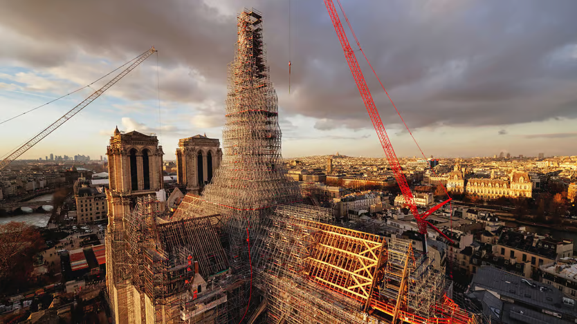 Восстановление Нотр-Дама — один из самых сложных и амбициозных проектов реконструкции исторического памятника, когда-либо предпринимавшихся Францией. Огонь охватил всю деревянную решетку, составлявшую средневековую крышу, прежде чем расплавить свинцовую обшивку и обрушить шпиль. Неф, хоры и трансепты собора практически не пострадали от огня благодаря мастерству каменщиков XII и XIII веков. Так же как и большой орган на 8000 трубок и витражи.