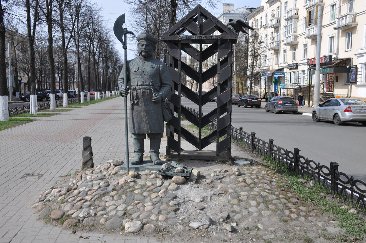 И снова публикация, дополняющая мои рассказы о памятниках и скульптурах города, пропущенных мной в предыдущих статьях. Начну с жанровой скульптуры, установленной на проспекте Ленина. Скульптура постового - подарок скульптора Елены Пасхиной к 1000-летию Ярославля. Именно на этом месте в конце XVIII века, на въезде в город из древнего Романова-Борисоглебска, находилась Романовская застава. Незнакомец, смотрим, человек простой, грудь понапрасну не выпячивает, но на ногах стопит твёрдо. И экипирован что надо: бердыш в одной руке, курительная трубка в другой, столовая ложка в сапоге, мешочек с махоркой про запас за поясом. Догадываемся, что служба у постового не пыльная, но требуется, как в боевом походе, быть готовым к любым превратностям судьбы. Зипун у служивого туго подвязан кушаком, чтобы не поддувало, дровишки для костерка заготовлены. Ещё одна жанровая скульптура, изображающая символ города создал народный художник России Николай Мухин. Медведь с протазаном (разновидность к