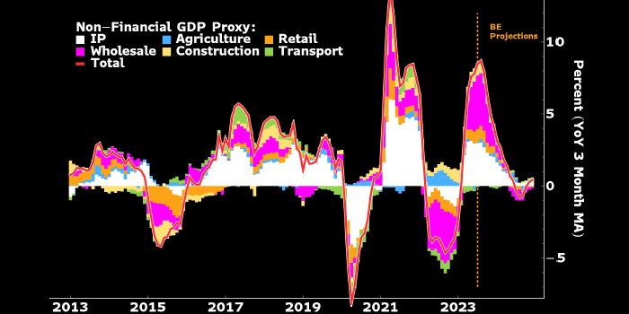На это указывает наклон кривой доходности рублевых гособлигаций, пишет экономист Bloomberg Economics Александр Исаков. Вклад нефинансовых секторов в ВВП РФ (в % г/г, среднее трехмесячное значение): белым — промпроизводство, голубым — с/х, оранжевым — розничная торговля, фиолетовым — оптовая торговля, желтым — строительство, салатовым — транспорт, красным — совокупный показатель. Источник: Bloomberg «Наша макроэкономическая модель оценивает вероятность рецессии в России в следующие шесть месяцев в 80%», — пишет экономист Bloomberg Economics Александр Исаков. По его словам, данная аналитическая модель основана на наклоне кривой доходности рублевых гособлигаций, который является опережающим рецессионным индикатором. Высокая вероятность рецессии хорошо укладывается и в секторальную экономическую модель, которую Bloomberg Economics разработала для России, отмечает эксперт. В частности, по оценкам данной модели, годовые темпы роста циклических секторов в РФ (оптовая и розничная торговля, а т