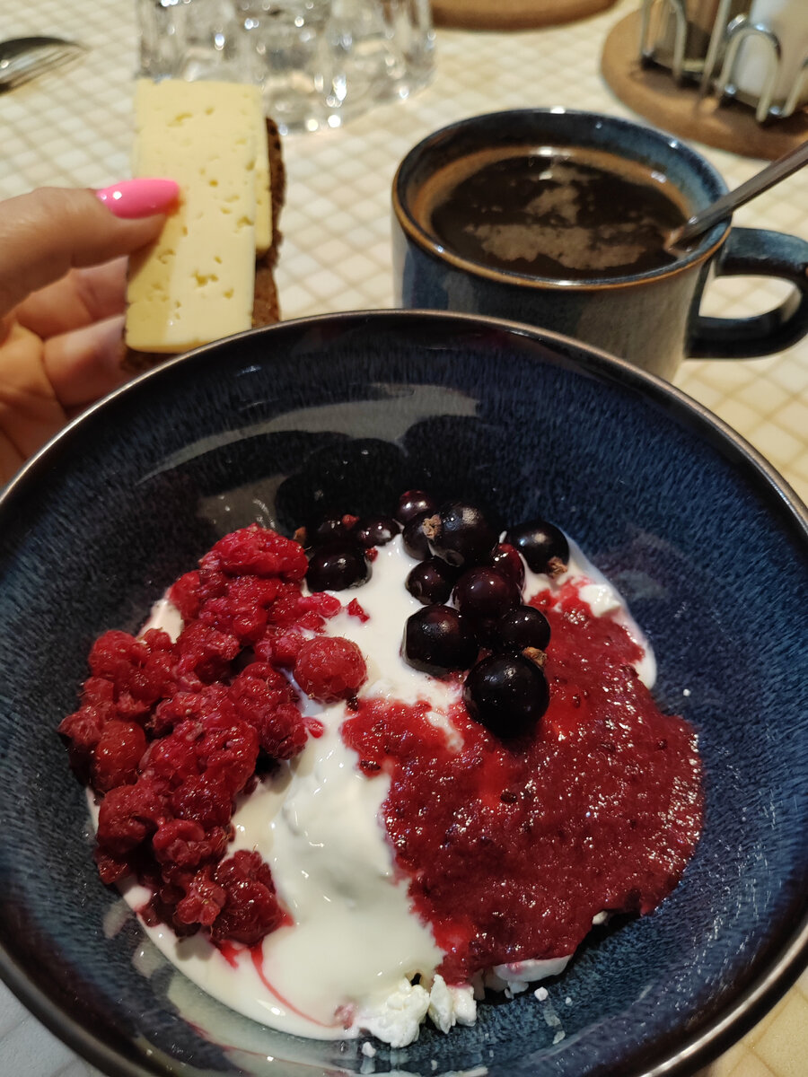Творог со сметаной, ягоды, хлеб и сыр, кофе без сахара
