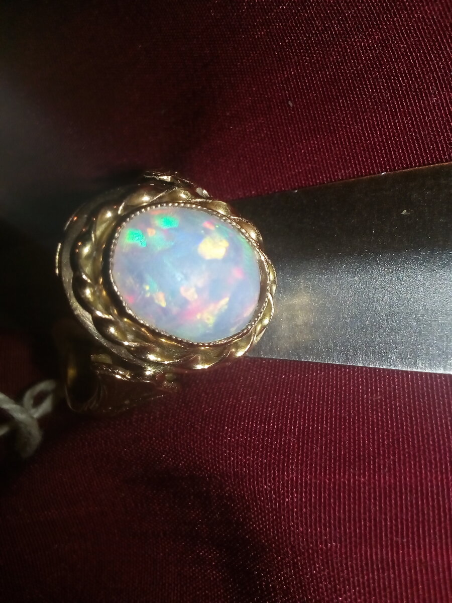 Итак, в СССР секса не было. Как и ювелирных украшений мирового маштаба. А была - гребля. Как правило - академическая. И на байдарках. Н-да. О чем бишь я? А, о фото... Ну, это нам только давай... :0)))) Могли советскоо специалиста послать В Эфионию? Мог он оттуда привести камушек? Мог отдать камушек мастеру в Рембыт техника? Ну, вот... Перед вами то, чего не может быть. Советское кольцо с эфиопским опалом... Опал - он же разный, когда его рассматриваешь. Попробовал сфотографировать по иному. А это из Свердловска 1989 года. Тоже уникальное из-за камня. Ну и попытка максимально уйти от советкости - зачетна. А вот на фоне обручалки. Серьги из Узбекистана. 1979 год. Уникальность в том, что в СССР всем заводам камни поставляли централизовано. А тут хризопразы свои. В перстеньке - обычный крашеный. Видите разницу? Вот еще продукция крупного завода (Ленинград). С берильчиком. Понятно, что такое на поток не поставить... (В жизни камень чуть позеленей). А вот Якутия... 1976 го