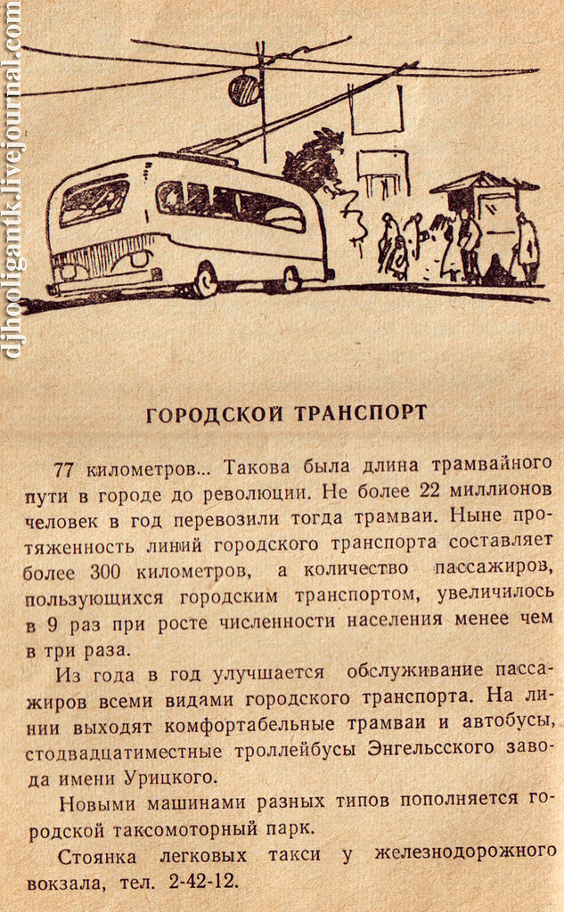 Итак, перенесёмся на 60 лет назад, когда на весь Саратов было 2 бензоколонки, но уже можно было взять напрокат автомобиль. Вас несомненно порадует и то, что тут даны не просто конечные остановки маршрутов, но и расписан весь путь следования! Кроме автобусов тут расписан и весь остальной транспорт Саратова в тот год.