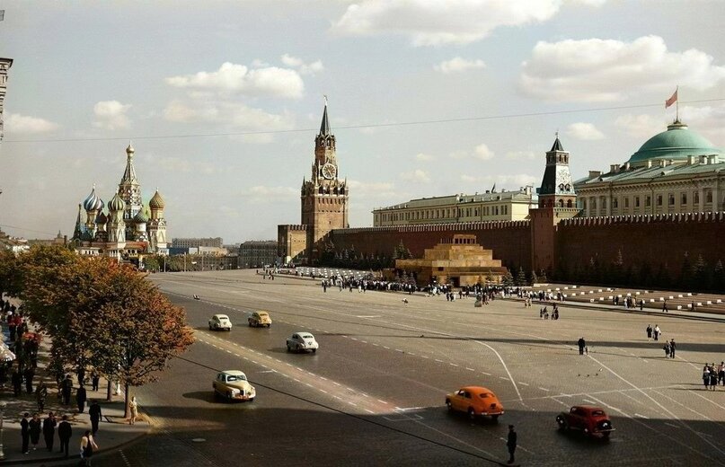 Москва 1950-х годов характеризовалась восстановлением города после разрушений Великой Отечественной войны, развитием социалистической экономики и укреплением советской власти. В городе было построено новое жилье, инфраструктура и культурные учреждения, в том числе культовый Московский государственный университет и система Московского метрополитена. Однако это было также время политического угнетения, цензуры и ограничения личных свобод. Напряженность времен холодной войны между Советским Союзом и Западом также достигла своего пика в этот период. Давайте посмотрим фотографии Семёна Фридлянда, прошедшие через колоризацию. Красная площадь, 1956 год. ВСХВ. Главный павильон, 1954 год. Сейчас спустя почти 70 лет Выставка достижений народного хозяйства потихоньку приобретает свой исторический облик. Кафе «Дружба» на улице Петровка, 1954 год. Красные дома и дом преподавателей МГУ, 1954 год. Площадь Маяковского. Концертный зал им. Чайковского, 1956 год. У Крымского моста, 1957 год. Москвичи иду