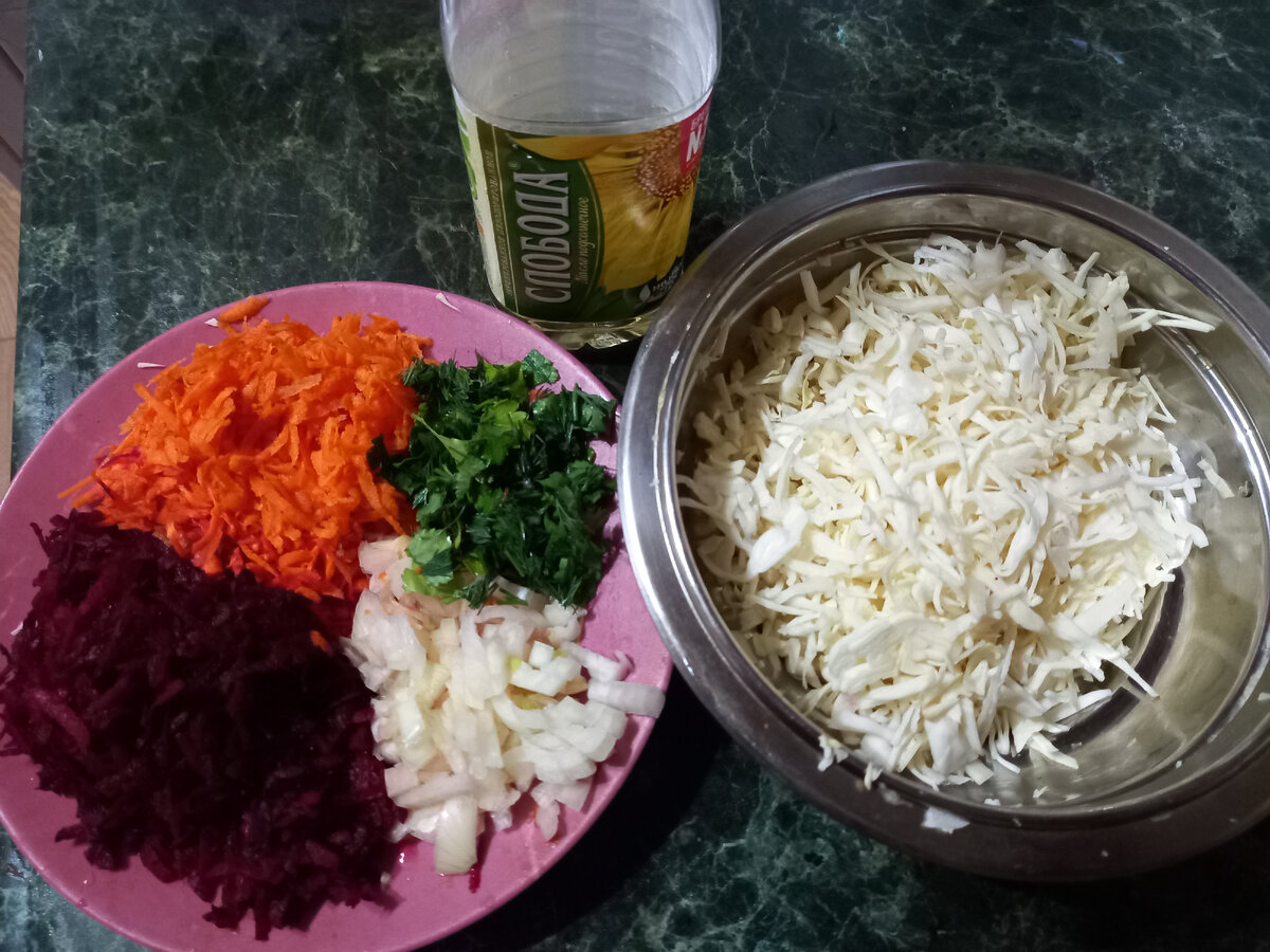 На 6 порций: Капуста белокачанная - 250 г., Свекла - 1 шт., Морковь - 1шт., Лук репчатый - 1 шт., Петрушка, укроп - по вкусу, Соль - 1 ч.л., Подсолнечное масло - по вкусу. Нарезать мелко капусту, лук, петрушку и укроп, свеклу и морковь потереть на тёрке. Смешать все ингридиенты. Приятного аппетита! Если понравилась статья, подписывайтесь на мой канал - буду очень рада.