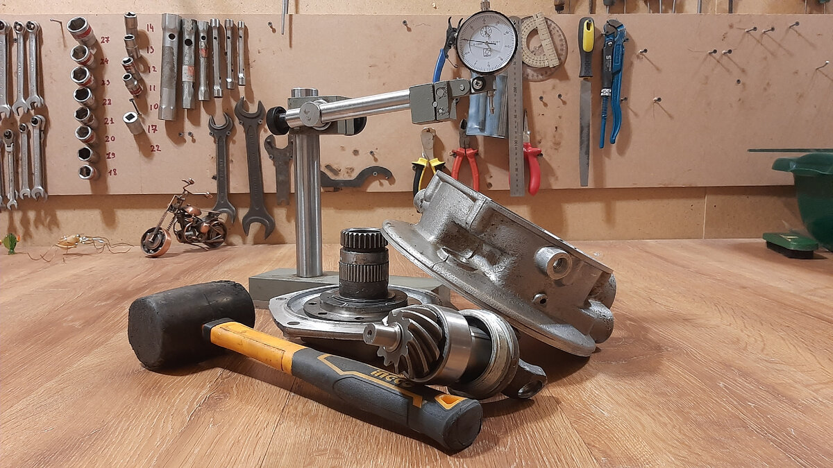 Честно говоря, первоначально я не планировал выравнивать ступицу. Поскольку эластичности сальника, по идее, должно хватить на то, чтобы компенсировать имевшееся биение. В частности, Котов и Капустин пишут, что износ ступицы в указанном месте допускается до 0,5 мм включительно. По этой причине я поставил шестерни, запрессовал ступицу на крышку, прикрутил все это на корпус редуктора и посмотрел что в итоге получается. А вышло совсем плохо. Перекос ступицы относительно корпуса составил около 1 мм.