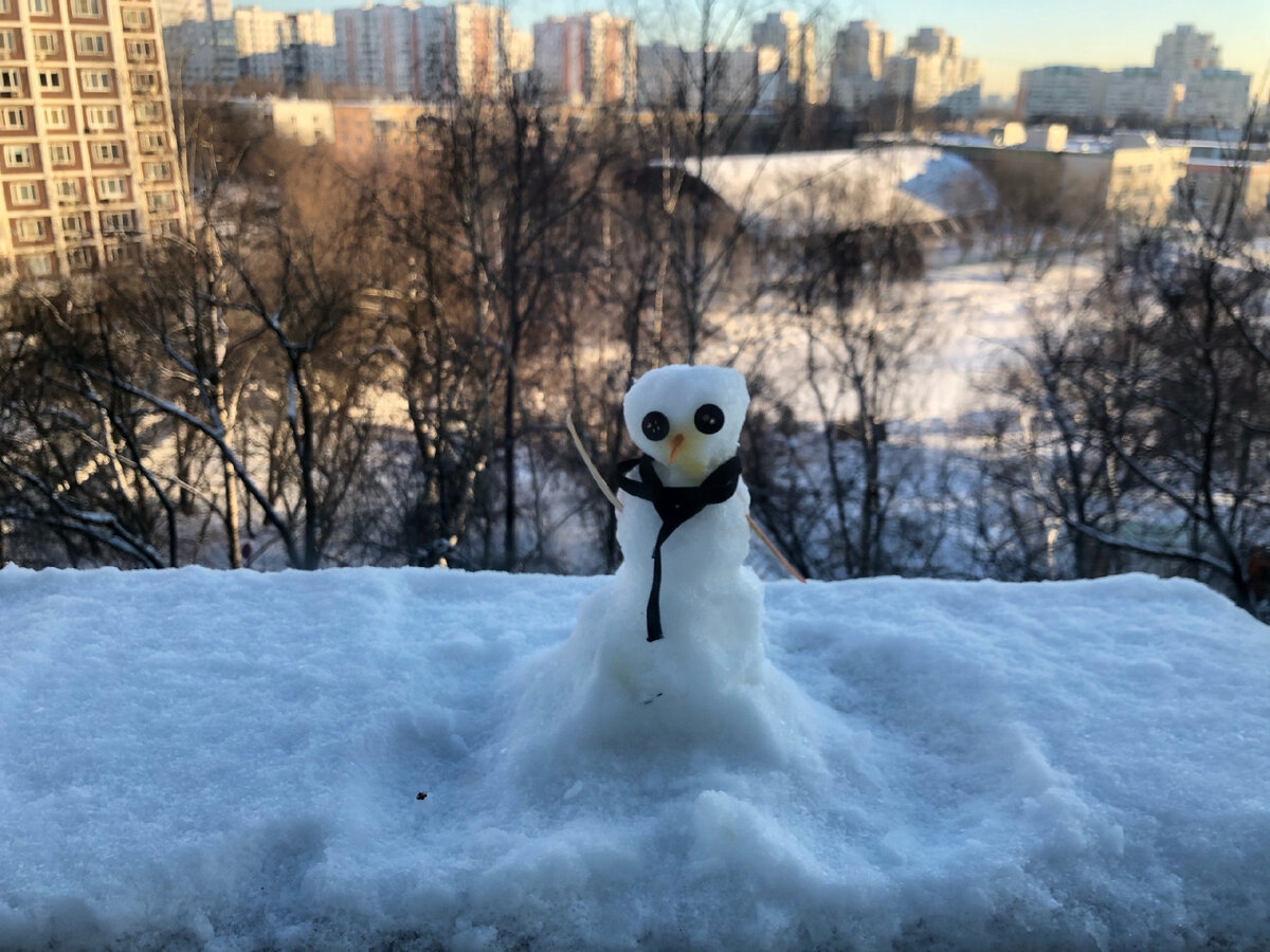 У нас за окном поселился снеговик. Его сделала Алеся, принесла с улицы и поставила на кондиционер, торчащий из стены дома прямо напротив детской. Снеговик получился очень милый, что мы сразу привязали к нему. Потом несколько дней был снегопад, и его засыпало почти по голову, на макушке образовалась шапочка-колпачок. Снеговик выглядывал из сугроба и, как Лунтик, говорил: "Я родился".
