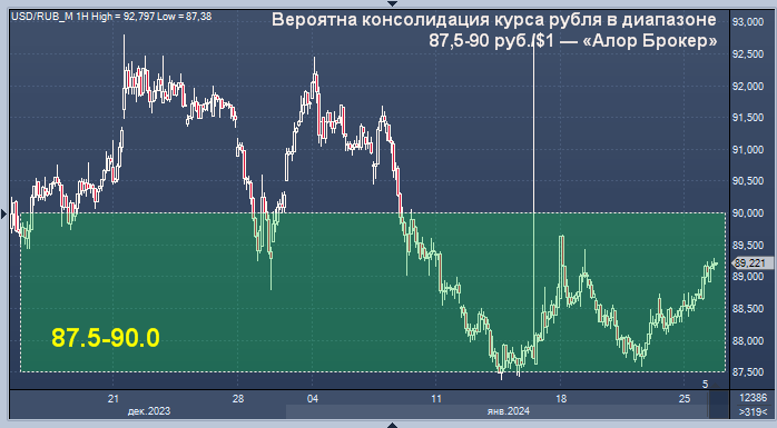 Вероятна консолидация курса рубля в диапазоне 87,5-90 руб./$1 — «Алор Брокер» Курс доллар/рубля на Мосбирже интервалами в 1 минуту Курс доллар/рубля на Forex интервалами в 4 часа «Рубль проигнорировал рост нефти и приближение пика налоговых выплат. Сейчас корреляция российской валюты с сырьевым рынком не очень ярко выражена, а многие экспортеры стараются "размазать" продажу валютной выручки на весь месяц, не откладывая это на последние дни перед уплатой налогов. Следует также помнить, что расчеты за свыше 40% российского экспорта осуществляется за рубли, поэтому эффект налогового периода будет проявляться в рубле не так сильно, как еще в начале прошлого года.В целом же ожидаем продолжения периода стабильности рубля. Пока все говорит о том, что пара доллар/рубль хочет осесть в диапазоне 87,5-90 руб./$1. При появлении позитивных поводов, например, принятии решения о продлении обязательной продажи валютной выручки рядом экспортеров до конца года, не исключаем пробой этого диапазона вниз»,