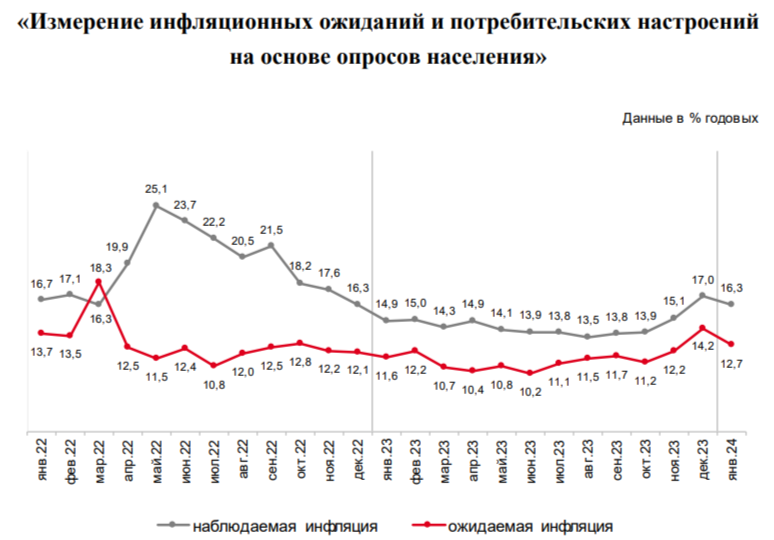 Ⓜ️ По последним данным Росстата, за период с 16 по 22 января индекс потребительских цен вырос на 0,07% (прошлые недели — 0,13%, 0,26%), с начала января — 0,46%, с начала года — 0,46%. Да, уже можно фиксировать снижение темпов инфляции (всё благодаря снижению цен на яйцо, куру, томат и перелёт в самолёте, последние два наименования нехарактерно снижаются, обычно показывая ежемесячный рост), но назвать это устойчивым фактором нельзя, ибо цены на бытовые услуги начали свой рост (значит, спрос перегрет). Также стоит отметить рост платы за жильё в домах государственного и муниципального жилищного фонда, напомню, что с 2024 г. тарифы на ЖКУ вырастут в среднем на 10% (основные тарифы с 1 июля, но уже с 1 января цены были повышены на капремонт, содержание дома и прочие услуги), поэтому нас ожидает весомый всплеск инфляции. Как минимум необходимо дождаться данных за конец января и начало февраля и тогда уже признать, работает ужесточение ДКП или нет. При этом ожидаемая и наблюдаемая инфляция сн