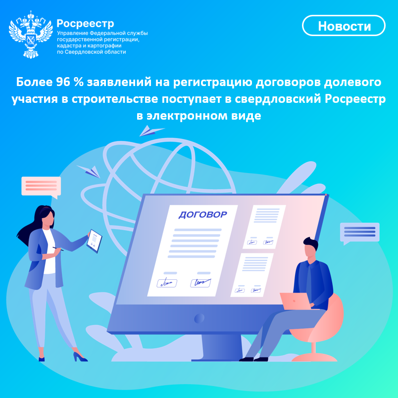 В настоящее время более 96% заявлений на регистрацию договоров долевого участия в строительстве поступает в Управление Росреестра по Свердловской области в электронном виде.