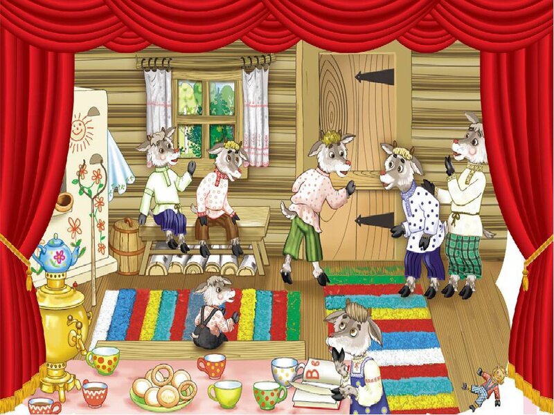 В оригинальной версии он тут же съел 6 козлят из 7. А после того, как сытно пообедал, решил поспать в их же доме. Когда Коза вернулась и увидела, что произошло, то пошла на отчаянный шаг. Она взяла большие ножницы и распорола волку брюхо. Затем вытащила козлят, положила в брюхо кучу камней и зашила его.