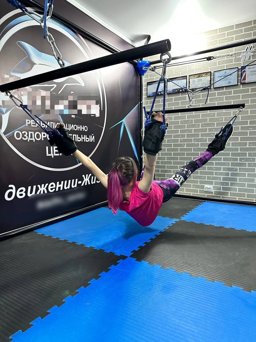 - Это деревянный или металлический параллелепипед с тросами, закрепленными на верхних углах. Человека закрепляют на тросах мягкими манжетами на руках и ногах, а затем приподнимают над полом. Уникальность тренажеразаключается в том, что тело человека свободно парит в воздухе, что способствует растяжению тканей за счет силы тяжести. Растяжение позвоночника помогает вернуть его структуры на естественное место, что освобождает зажатые сосуды и нервы. А растяжение мышц помогает нормализовать их тонус и у