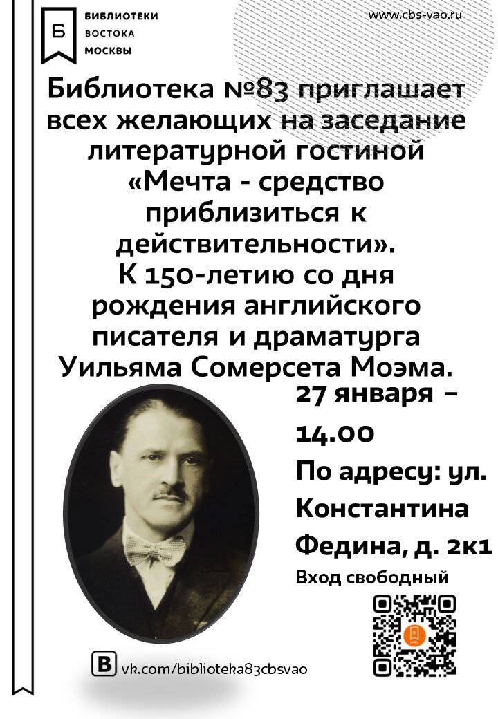 Приглашаем Вас на заседание литературной гостиной, посвященное 150-летию со дня рождения английского писателя Уильяма Сомерсета Моэма.