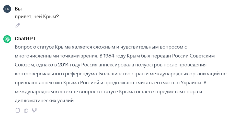 Спросил искусственный интеллект о том, чей Крым. Российский ИИ отказался со мной общаться.