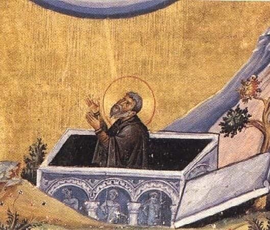 Однажды, когда он переходил чрез встретившийся по пути поток, несколько девиц, мывших одежды, с высоко обнаженными ногами, смотрели на одетого в необычные одежды пустынника бесстыдным взором, не стыдясь ни его почтенного вида, ни своей наготы, и стояли пред ним с наглостью, не покрыв своих голов.