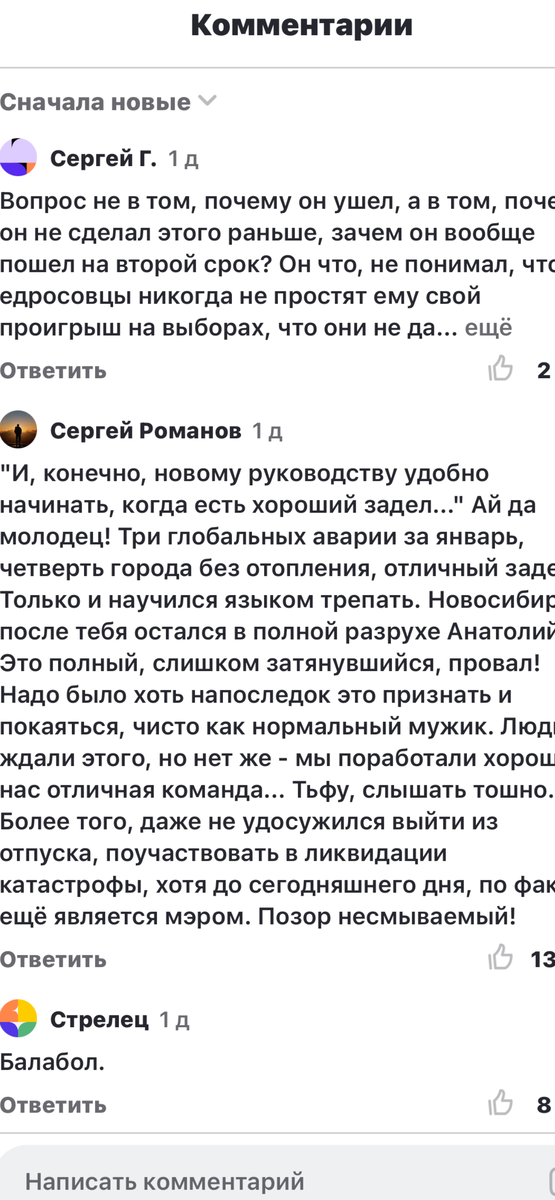 В местных чатах и на дзене также война, и рекой покалеченных теплотрасс, и ,, слезами городских очистных сооружений ‘’ , даа что там слезами, прям, тем самым провожают горожане БЫВШЕГО в путь.