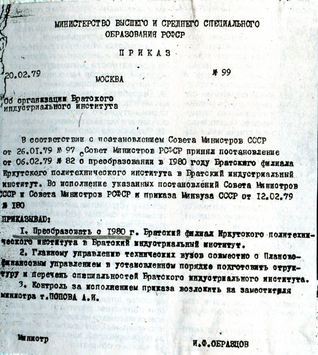 Со временем УКП перерос в общетехнический факультет, филиал Иркутского политехнического института, а затем стал самостоятельным вузом. Сегодня Братский государственный университет, выросший из маленького УКП - один из крупнейших университетских комплексов северного региона Сибири. За годы существования из его стен было выпущено около 50 тысяч высококвалифицированных специалистов. Среди них известные учёные, политики, бизнесмены и ведущие специалисты промышленных предприятий и организаций.