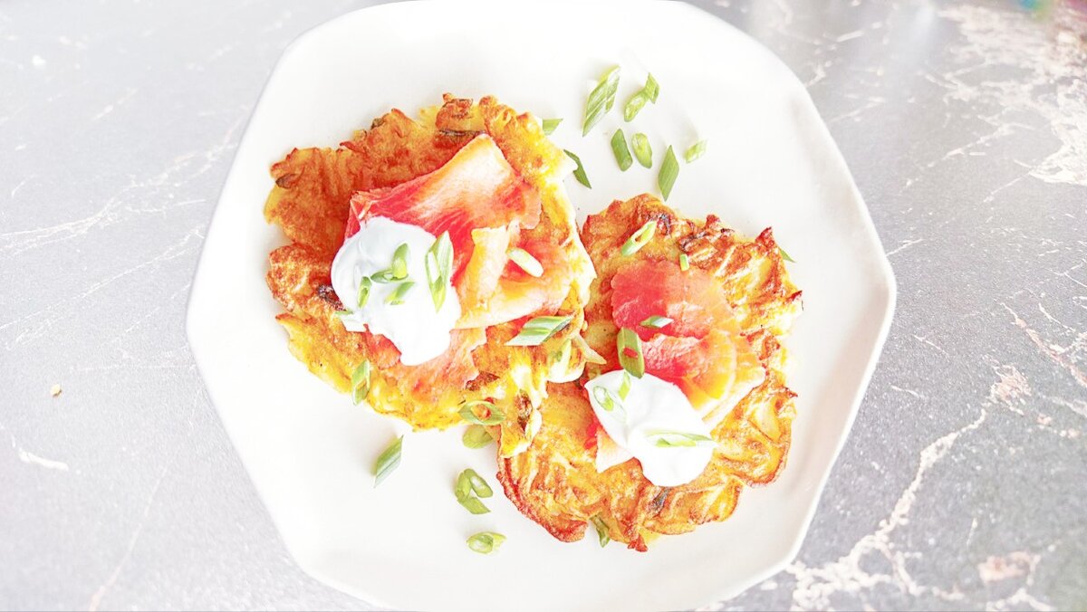 Когда вспоминаю вкусы из детства, то сразу бегу к плите. Не обошли стороной и мои любимые оладьи, рецепт которых, известен не многим. Оладьи картофельные со слабосоленой форелью. Несложно и изысканно! Ингредиенты: Подача: форель желательно слабосолёная 200 гр., 100 гр. сметанки, лук репчатый красный 1 шт., 40 гр. каперсов (можно заменить зелеными оливками или корнишонами). Итак, приступим! Берем терку желательно мелкую. На тёрке натереть картошку,после приступаем к петрушке, петрушку меленько порубить. В миске размешиваем йогурт, яйца, соль и немного взбиваем, у кого что есть, я использую миксер. Сюда же добавить разрыхлитель с мукой и всё тщательно еще раз, тщательно размешать. Соединить полученную массу с тертым картофелем, туда же добавляем петрушку и вновь всё хорошо размешать. Жарим оладьи, но только, на хорошо разогретой сковородке с добавлением небольшого количества масла (растительного). Теста я беру на одну оладушку примерно 2 столовые ложки. Обжариваем каждую оладушку ориен